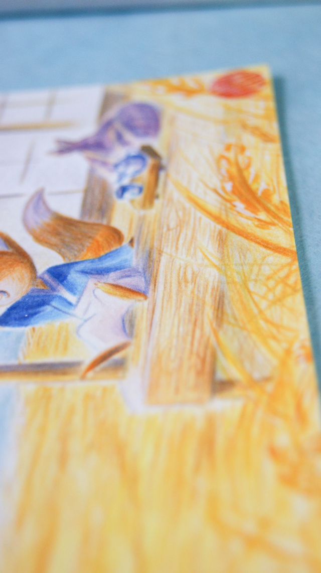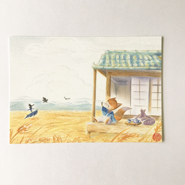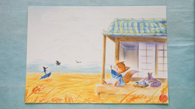 Un petit renard voyageur fait une pause sur le chemin pour manger des dangos et boire un thé vert. (Original A3 aux crayons de couleurs sur papier Vivaldi)