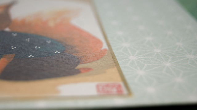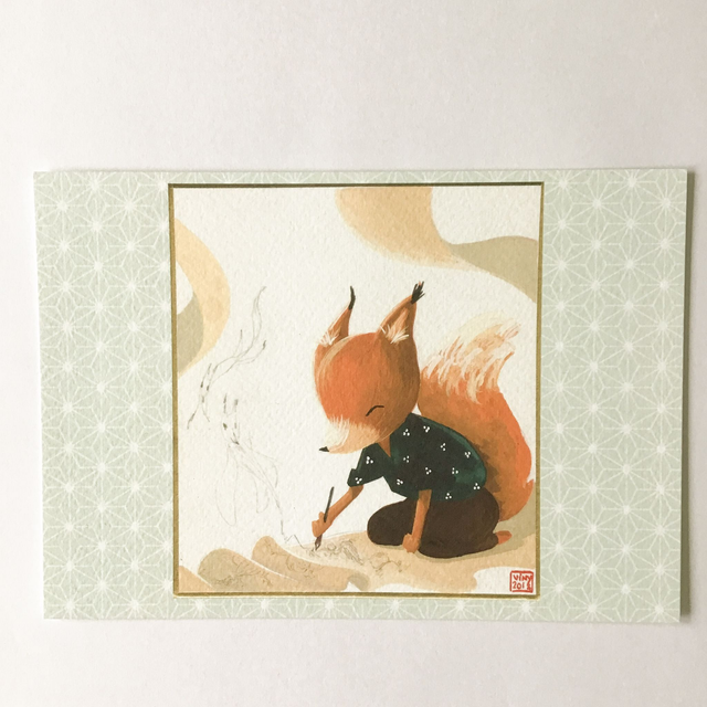 Un petit renard fait de la calligraphie. Original à la gouache sur shikishi japonais.